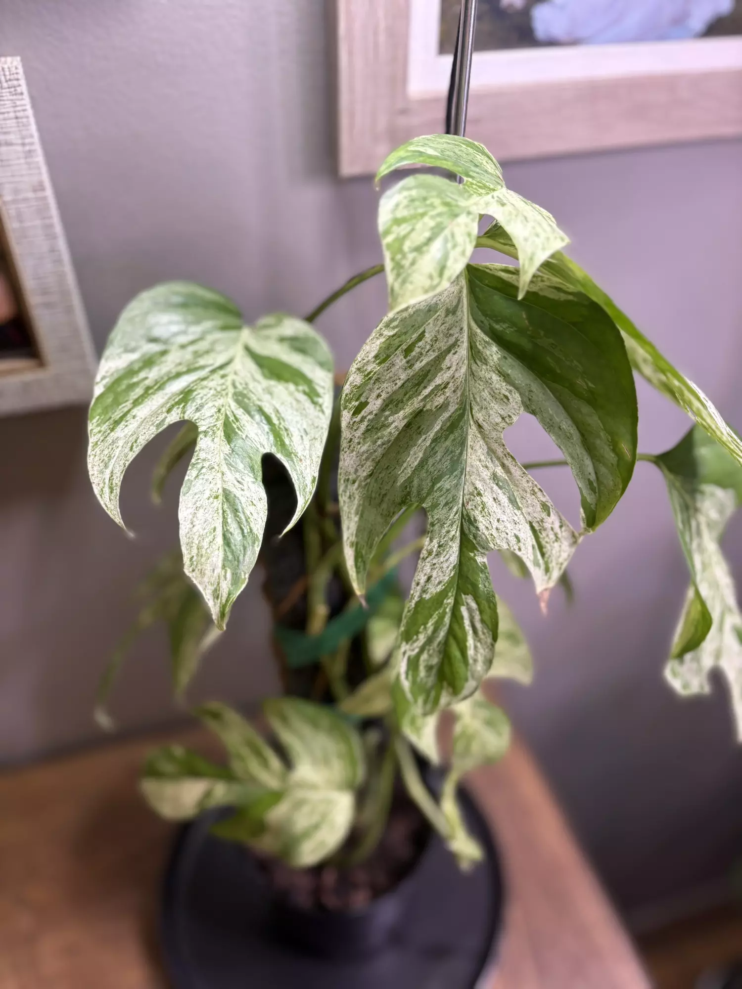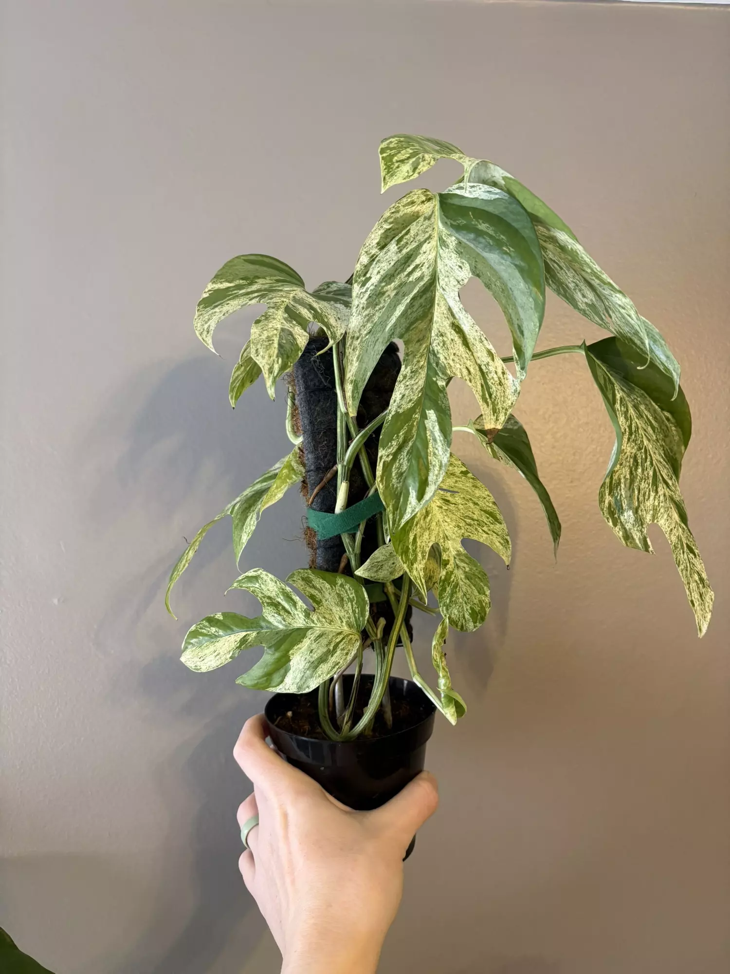 Epipremnum marble with great fenestrations! Secured on moss pole. Growing in ambient room conditions. Will ship UPS 2nd day air with Winter insulation included.
