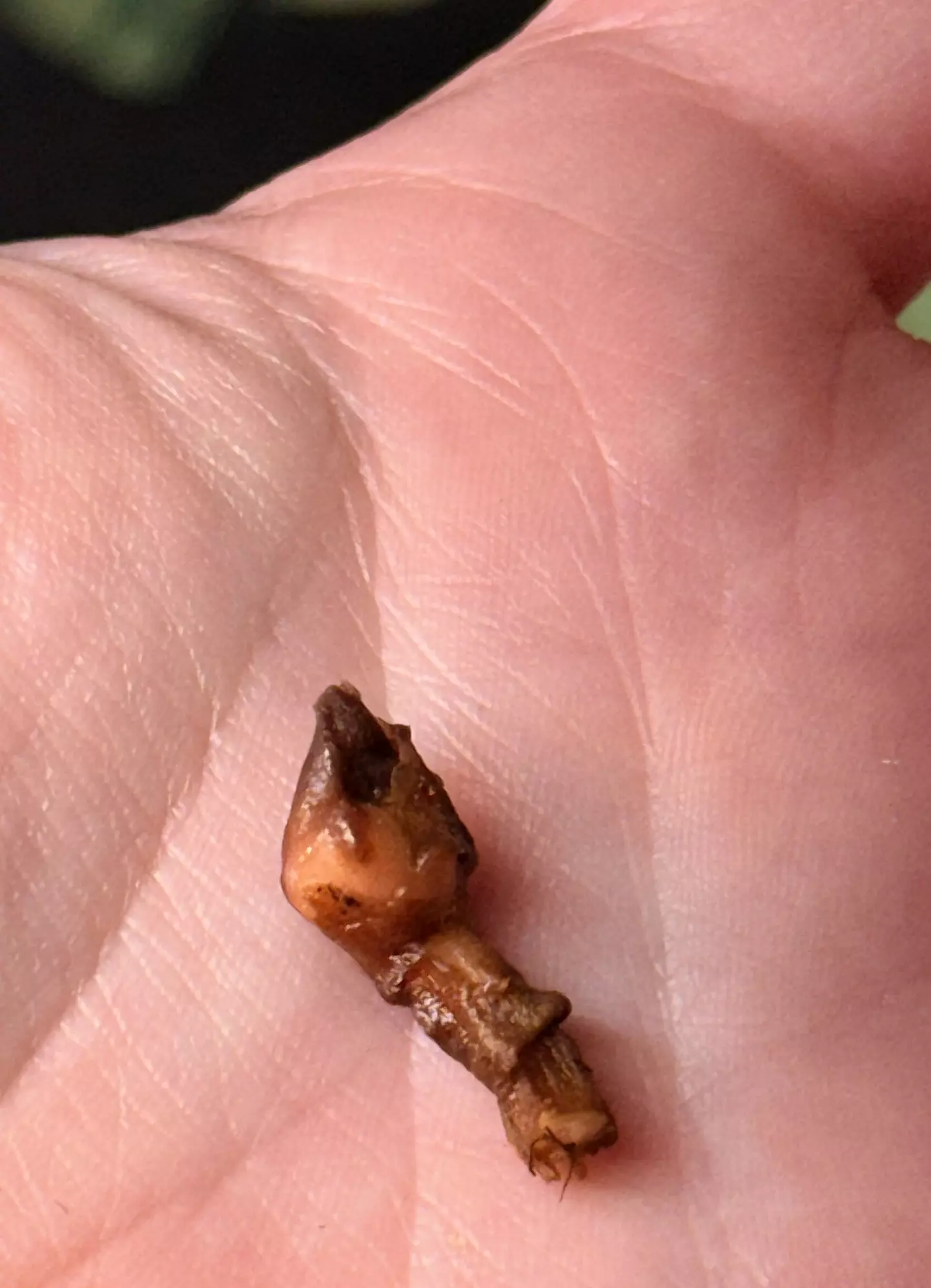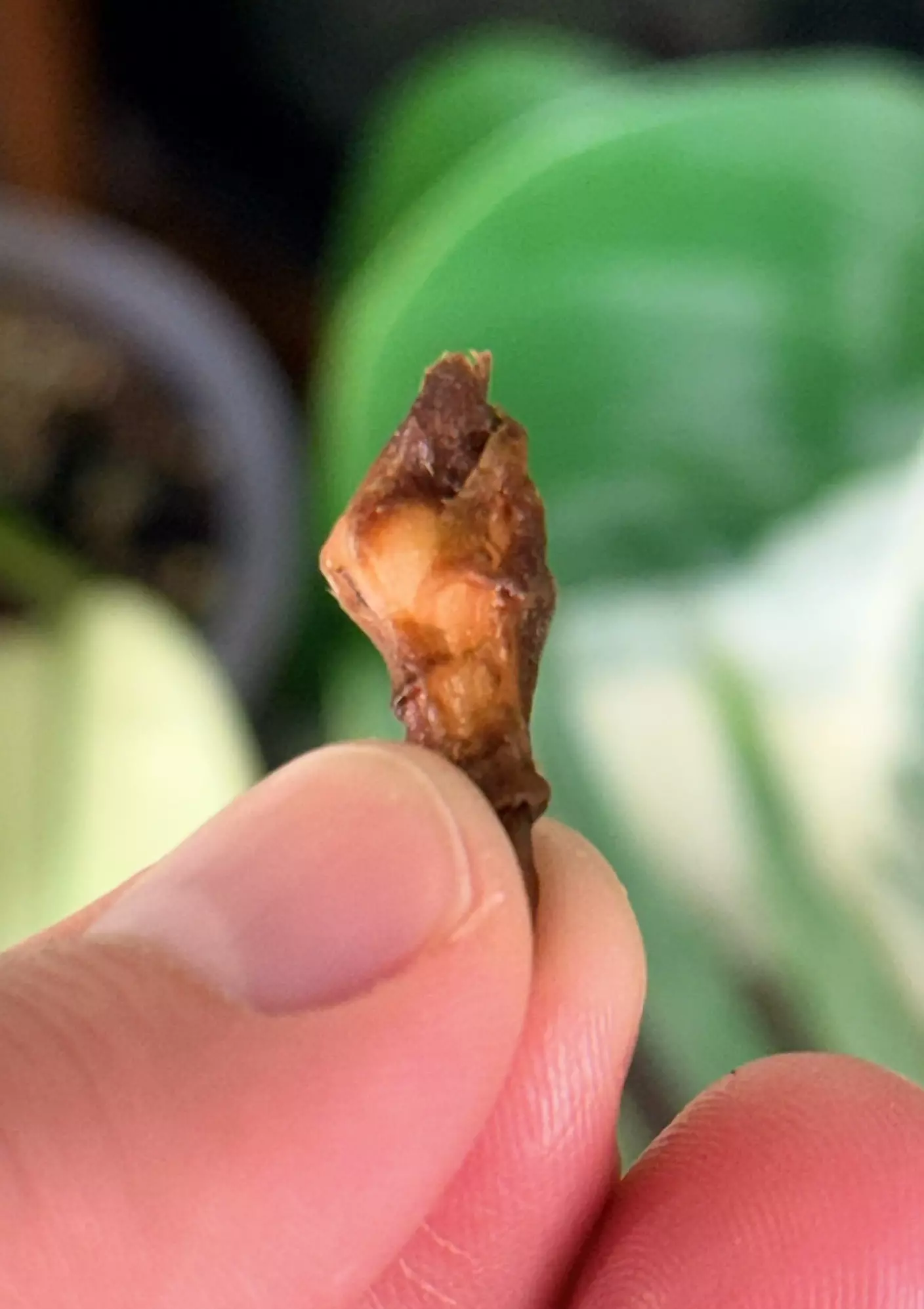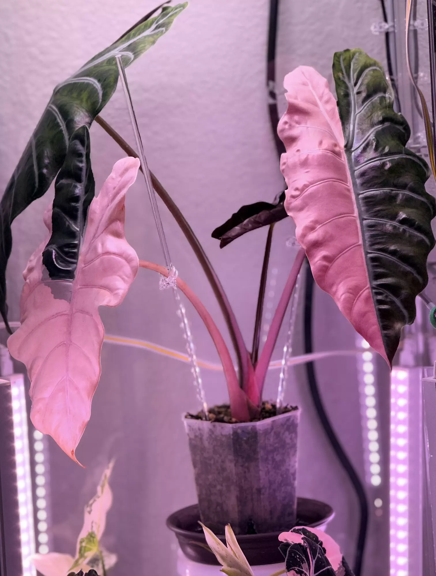 Healthy, starter-stage Alocasia Pink Chantrieri corm taken from the mother plant shown in the first photo. This is a viable, well-formed corm with a visible growth point and strong potential when established under proper conditions.
