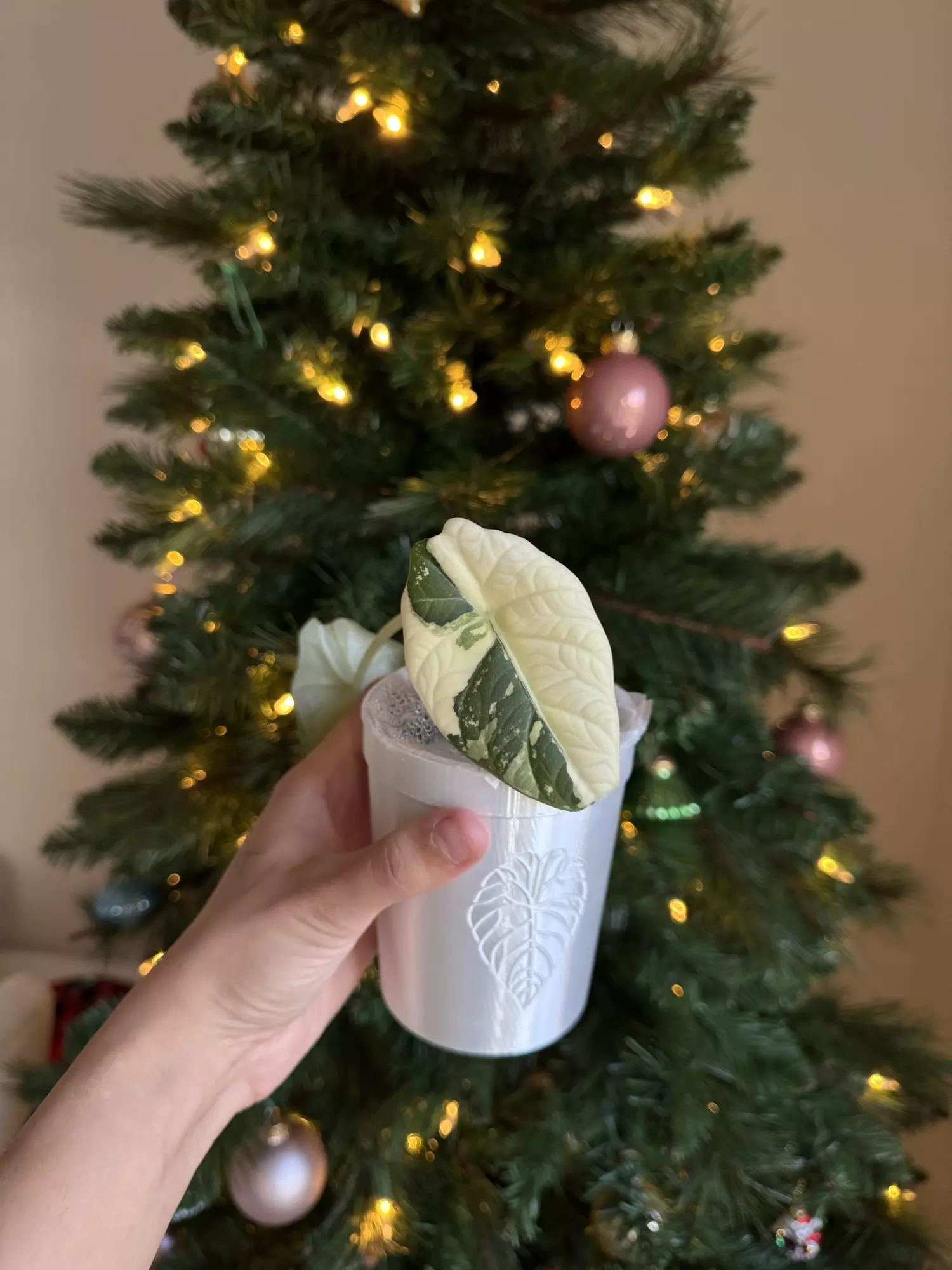 Beautifully variegated maharani albo pup from mama in last pic. Even better…she’s showing PINK. You can really tell with the back light on the bottom right of the leaf. Shipping includes UPS 3-day and insulation.