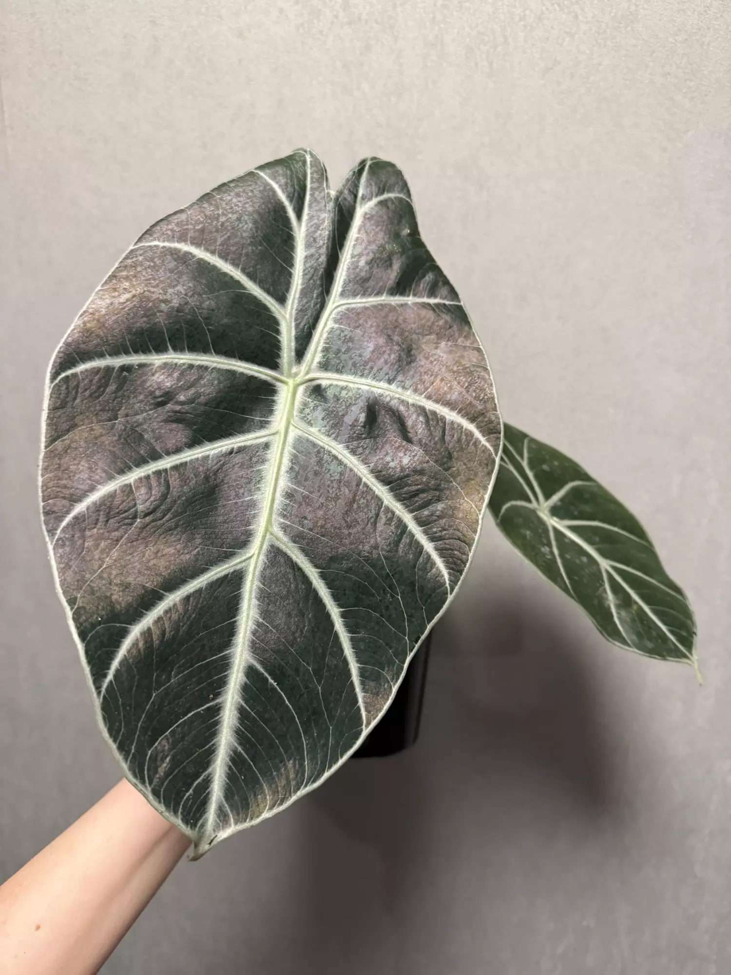 Mark Campbell is a hybrid of Alocasia Sanderiana x Grandis.