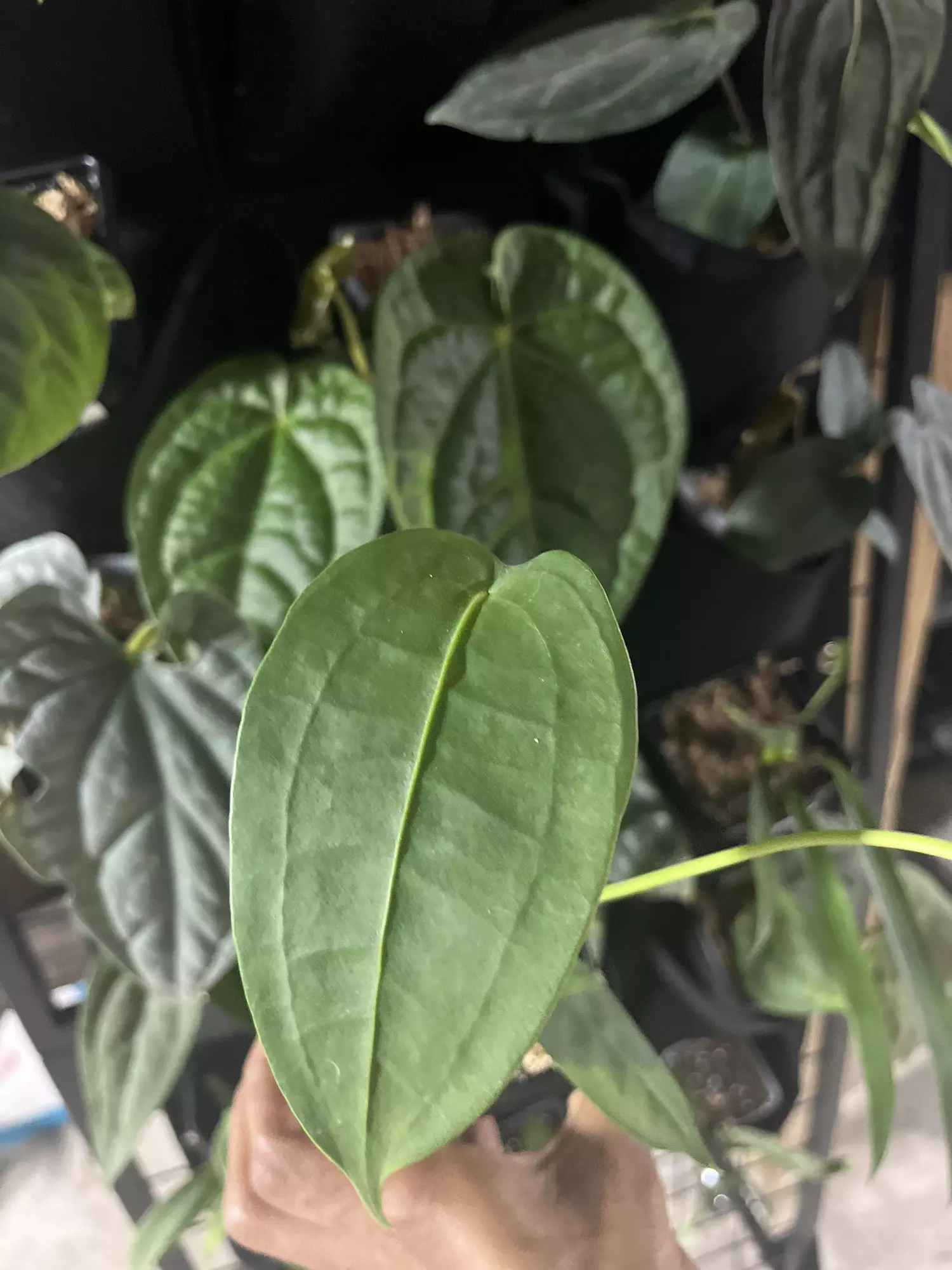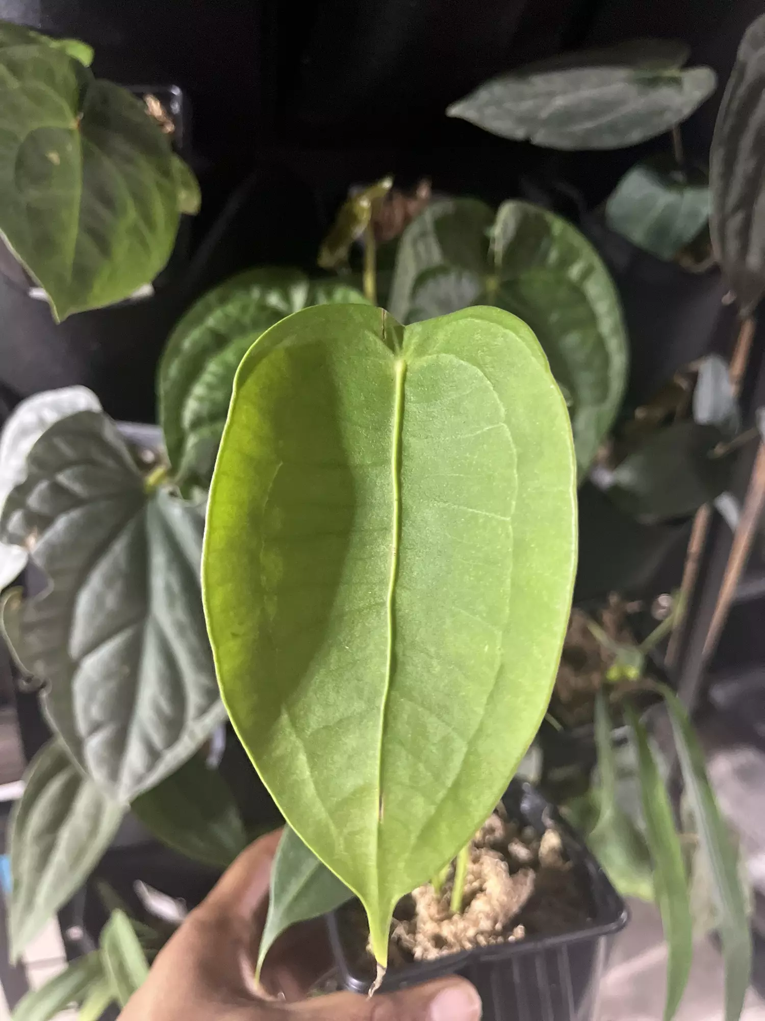 Beautiful juvenile Anthurium peltigerum with those classic elongated, paddle-shaped leaves that this species is known for. Healthy, firm foliage and an actively growing plant — perfect for anyone collecting slender-leaf anthuriums.