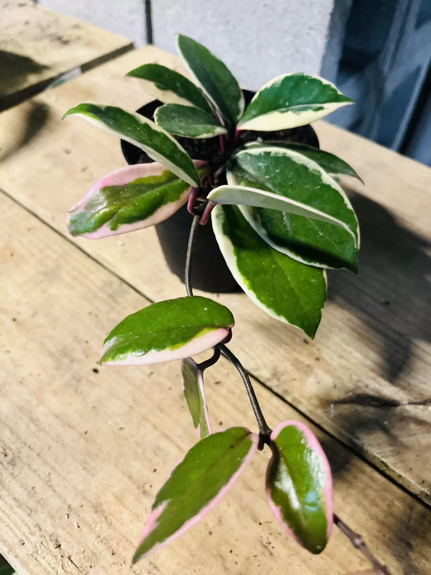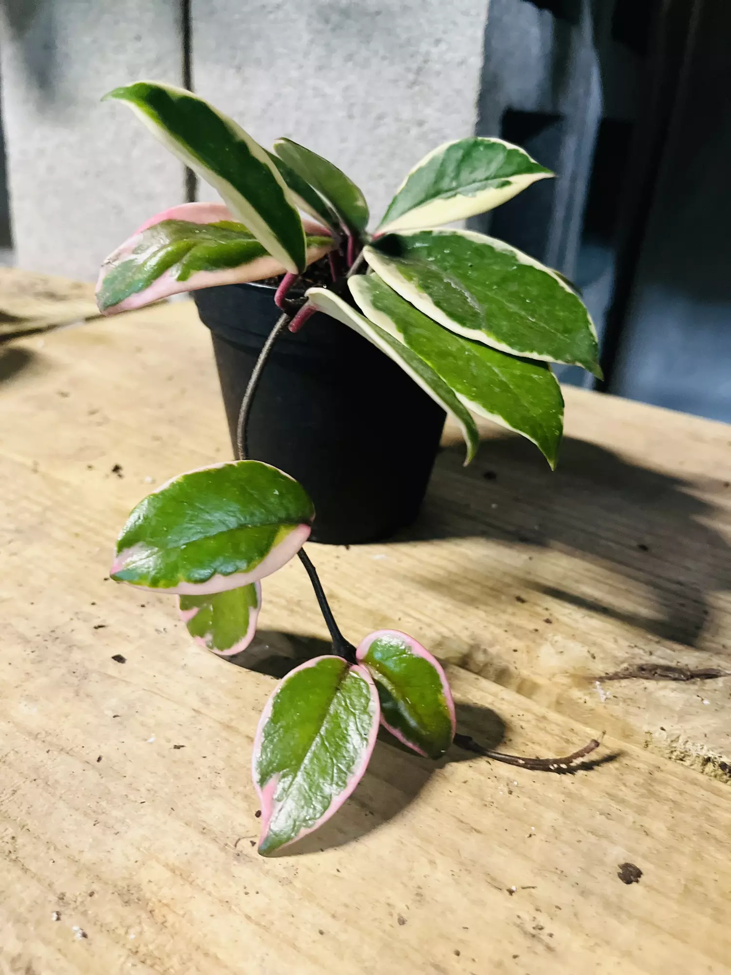 A true stunner for Hoya lovers โ Hoya Flamingo Dream (also known as Purple Pride) is a gorgeous cultivar that dazzles with its mix of pink, cream, and emerald variegation. New growth flushes with bright fuchsia and soft mauve tones that fade into glossy green and cream as the leaves mature.