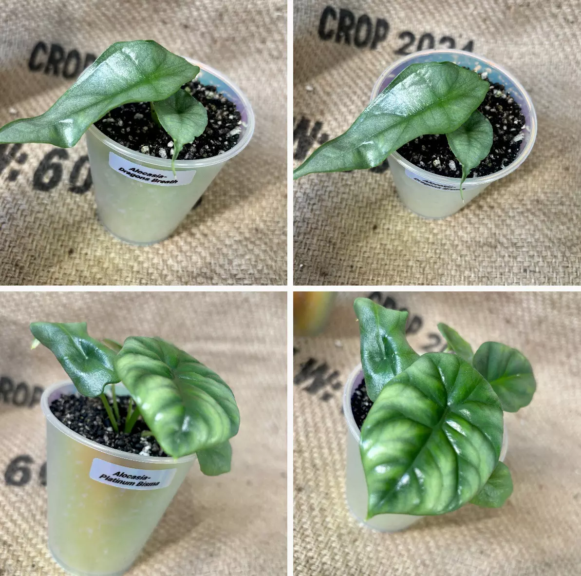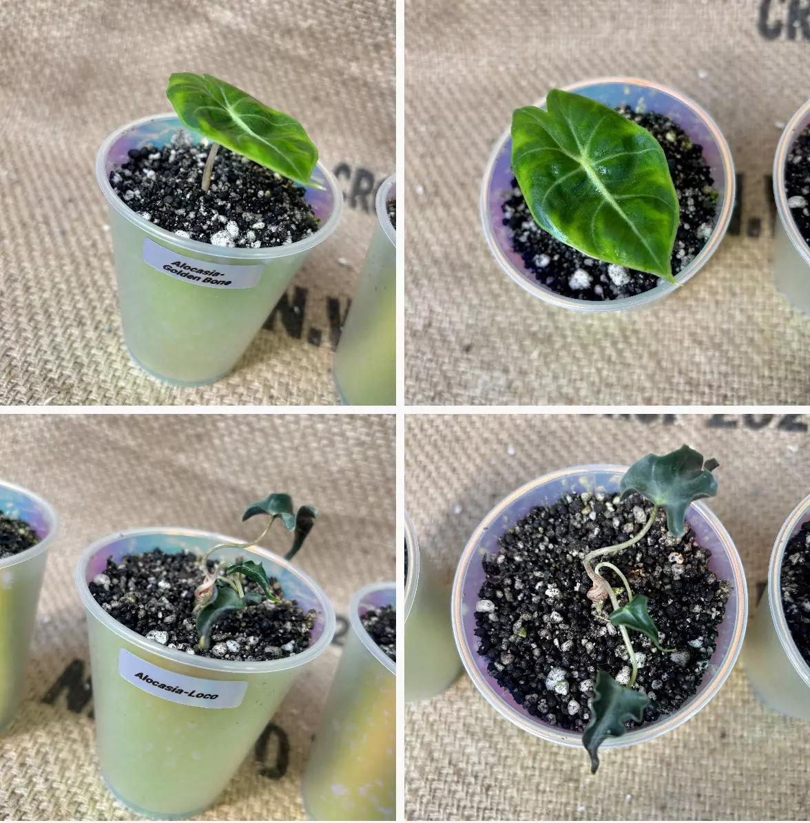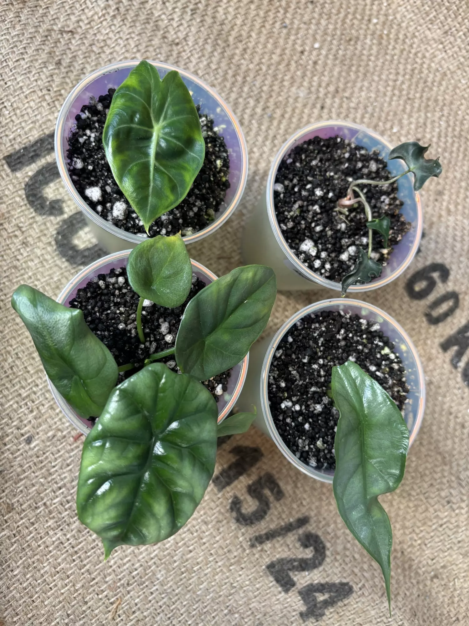 Four Alocasia Bundle. Auction includes: Alocasia Golden Bone, Alocasia Loco, Alocasia Dragons Breath, Alocasia Platinum Bisma. Exact plants in photos. Rooted in stratum and perlite. Super cute iridescent 3.5” cups included!