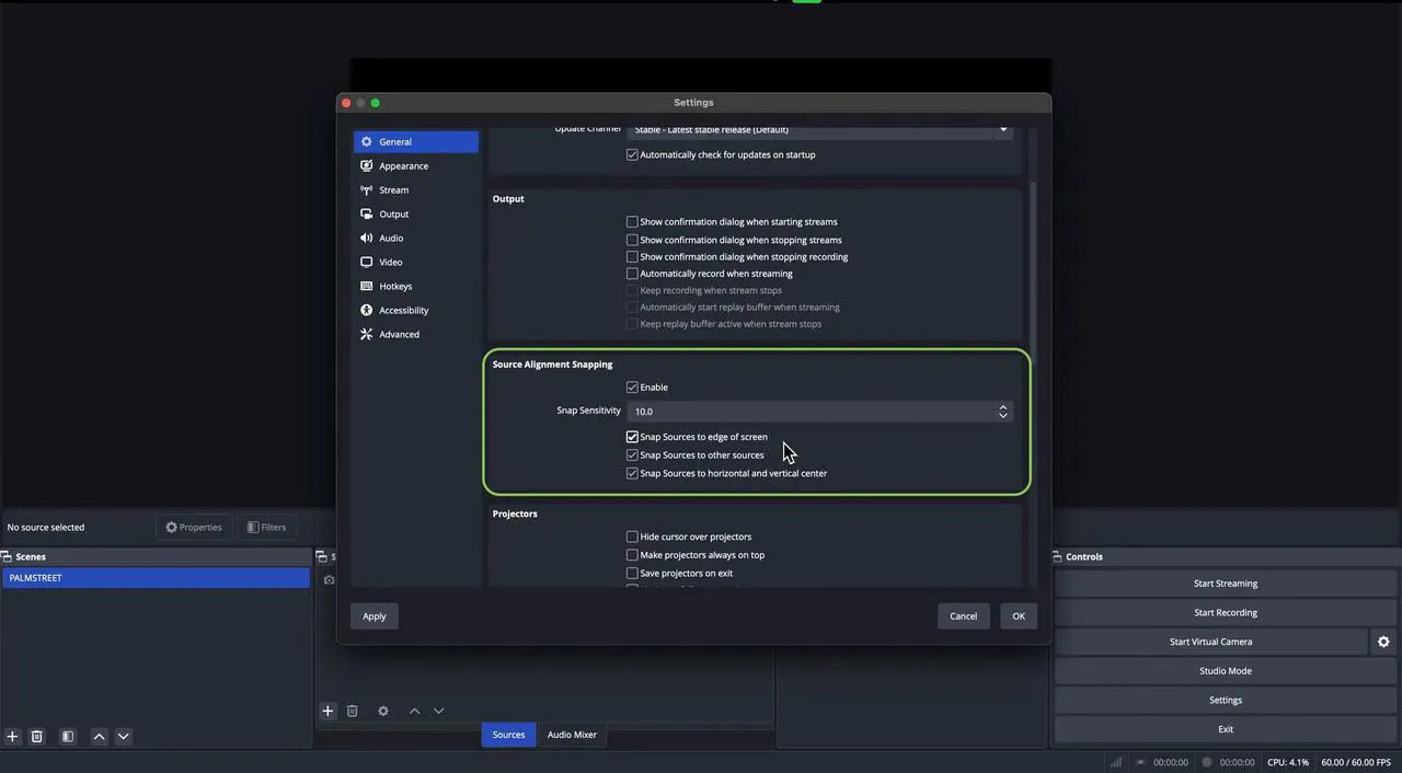 Begin by resizing the source you added, making it slightly smaller, and then dragging it to the center of the canvas. It should automatically snap into place along both the horizontal and vertical axes. Next, adjust the source so it stretches to touch both the top and bottom edges of your canvas. The snapping feature will help ensure precision. Once the main source is centered and expanded to fit the top and bottom of your canvas, you’ll have an accurate representation of what will appear in your stream on Palmstreet.