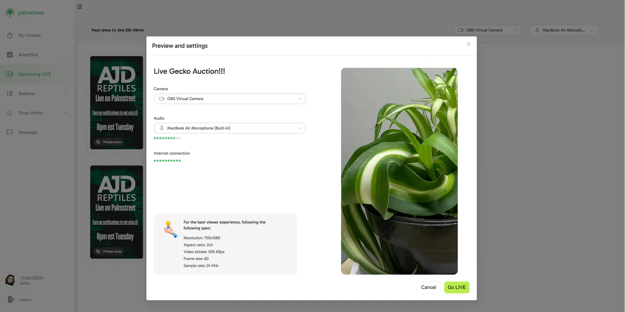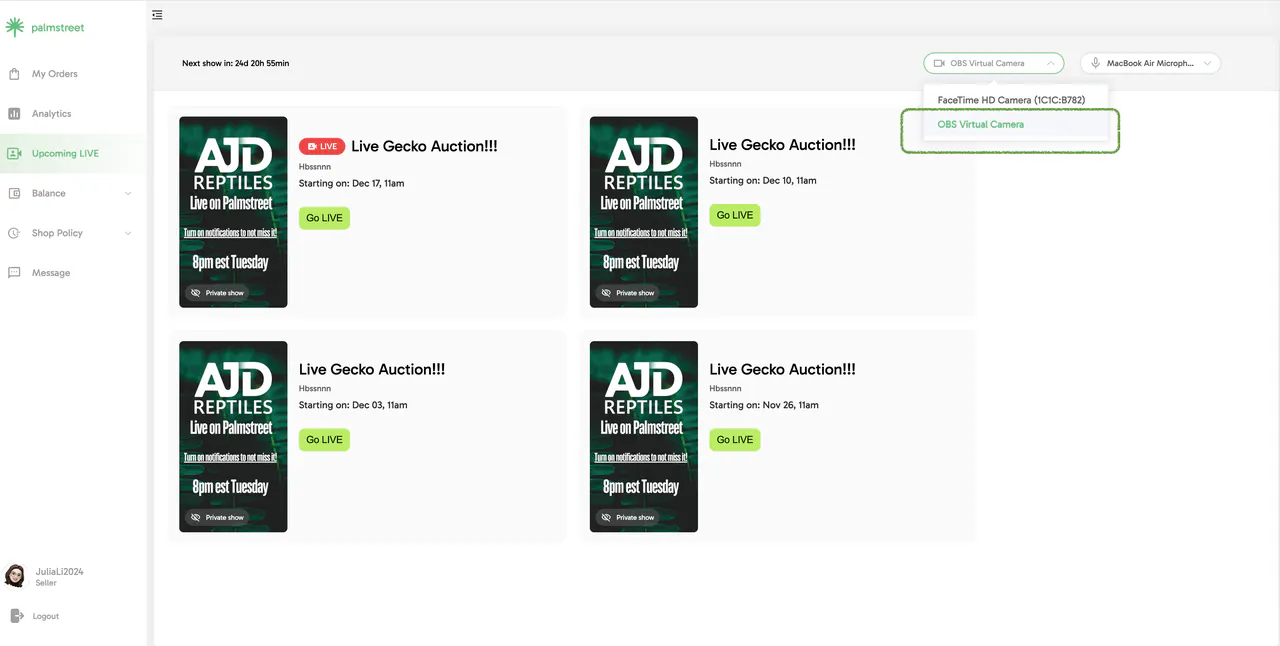 Palmstreet sellers can now take their live streaming to the next level by using OBS (Open Broadcast Software) to broadcast video directly from a computer. Sellers also have the flexibility to choose an external audio source when starting their show via the web.