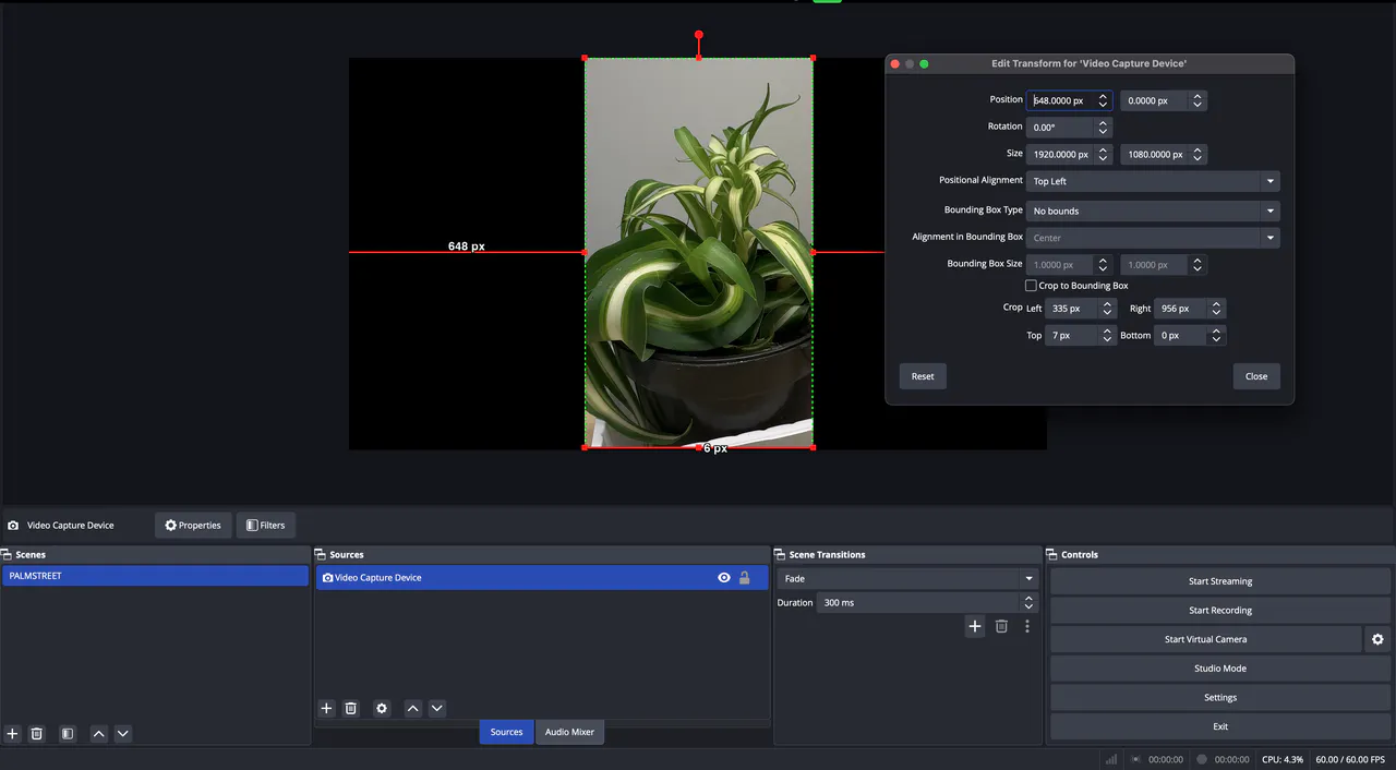 To ensure your OBS canvas displays correctly on your Palmstreet stream, resize the source you added by scaling it down slightly and positioning it in the center of the canvas. Once the main source is aligned and stretched to cover the top and bottom edges of the canvas, it will accurately reflect what viewers will see on your Palmstreet stream.