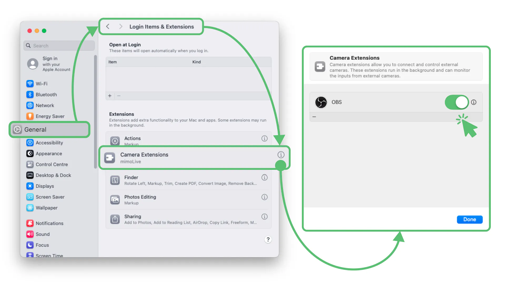 Q: What if I can't see the OBS Virtual Camera on my Mac?