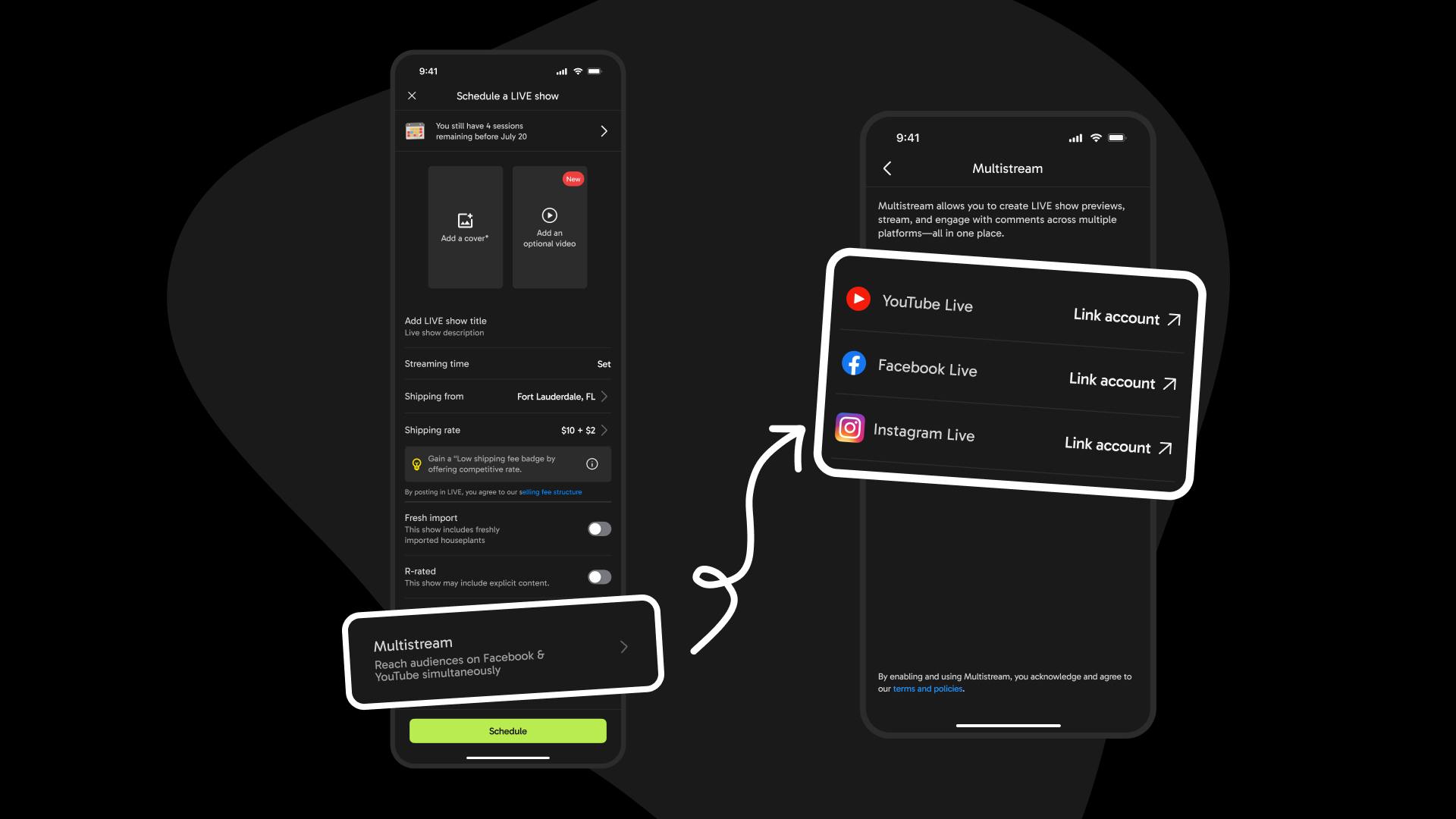 Palmstreet’s Multistream Feature enables sellers to broadcast their LIVE shows simultaneously across multiple platforms, including YouTube, Facebook, and Instagram. This powerful tool helps sellers: