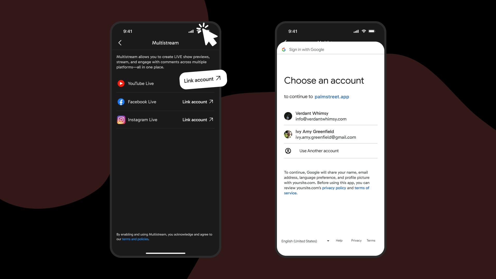 To support multistreaming, Palmstreet requests a limited set of permissions from connected social media accounts. These permissions are strictly limited to what is necessary for livestream setup and audience engagement: