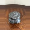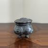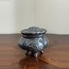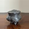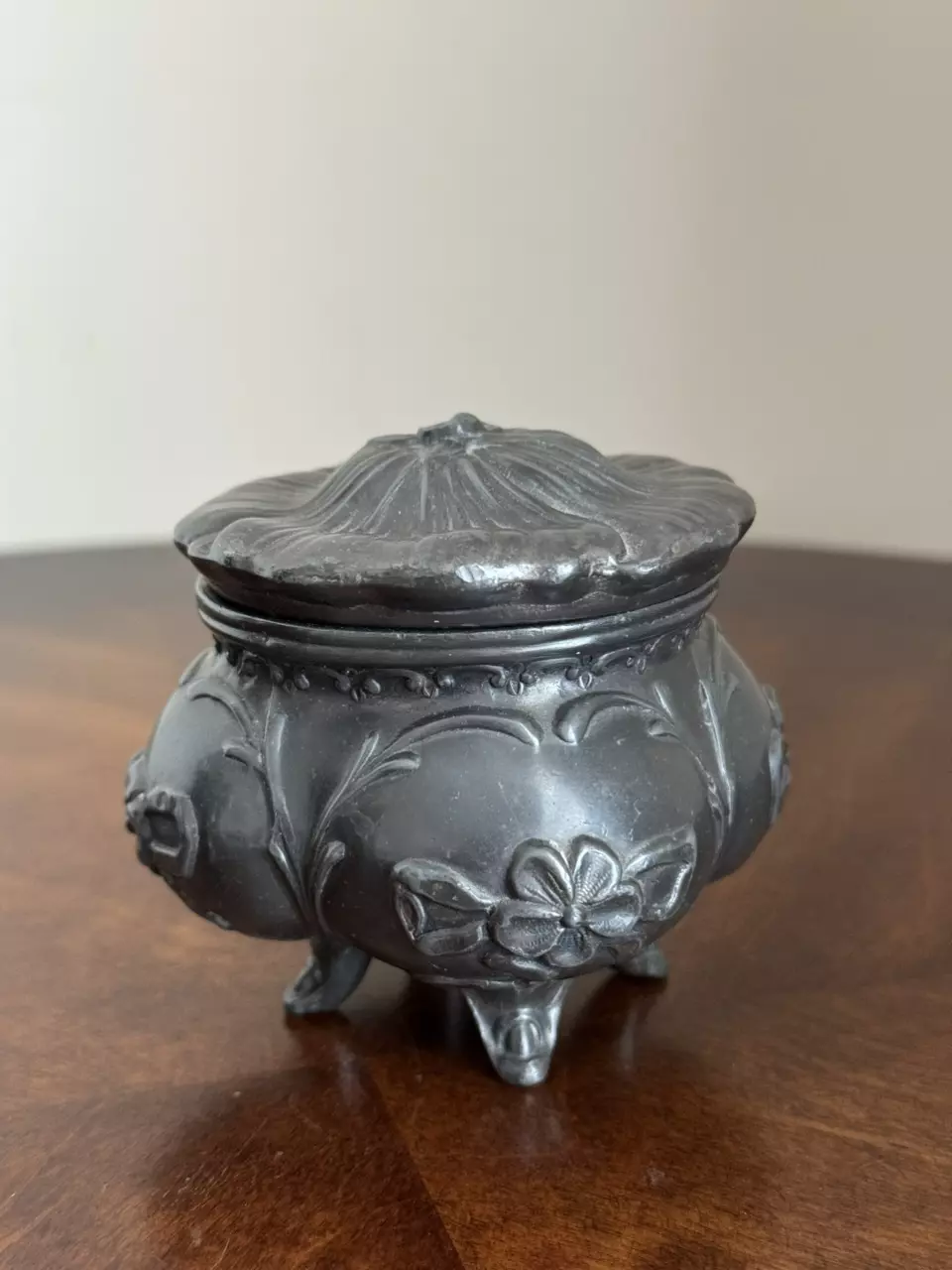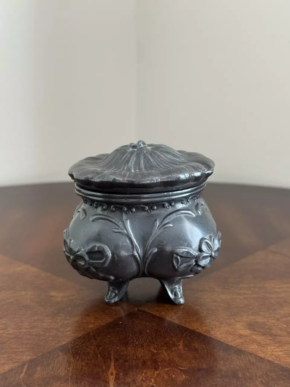 Antique silver-plated footed trinket box. In the classic elegance of Art Nouveau, adorned with floral designs all over with bow details. No interior lining or maker’s mark present. Tarnish present & slight loss of plating on interior. Perfect as a small jewelry box. Dimensions: 2 34” x 2 34” x 3”.