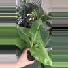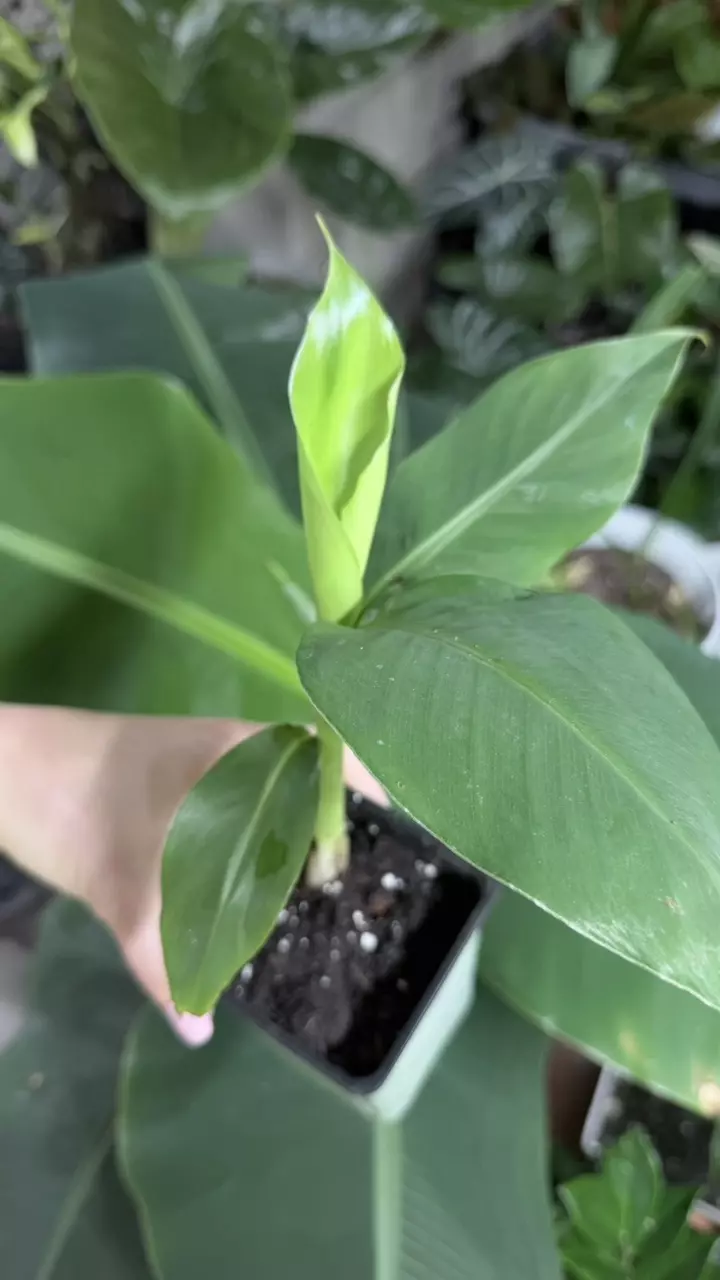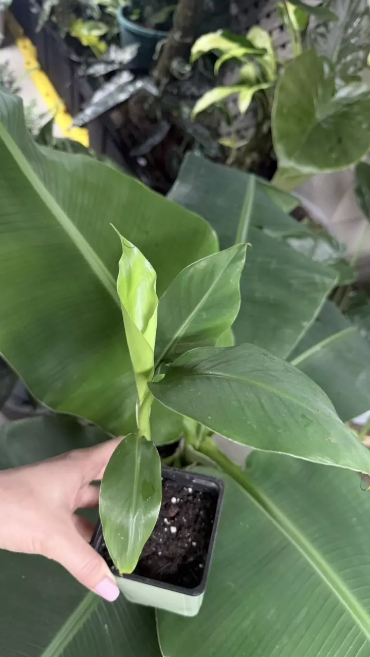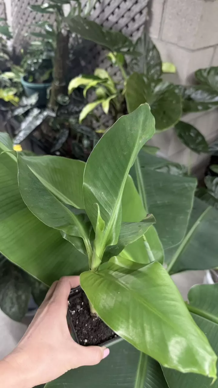 The last photo is an example of a leaf from the mother plant. A "Dwarf King" banana plant is likely a reference to a variety of Musa like the Dwarf Cavendish, which grows to be about 6-10 feet tall and thrives in warm, sunny conditions with well-draining soil. It requires regular watering and feeding during its growing season to produce its characteristic large leaves and potentially small, edible fruit.